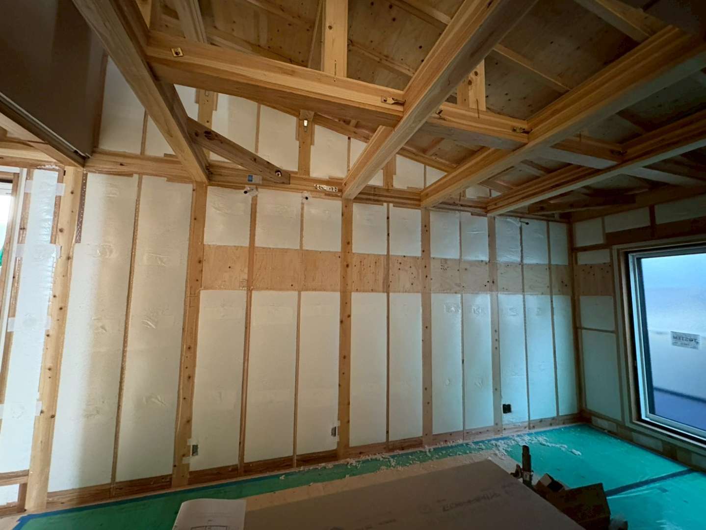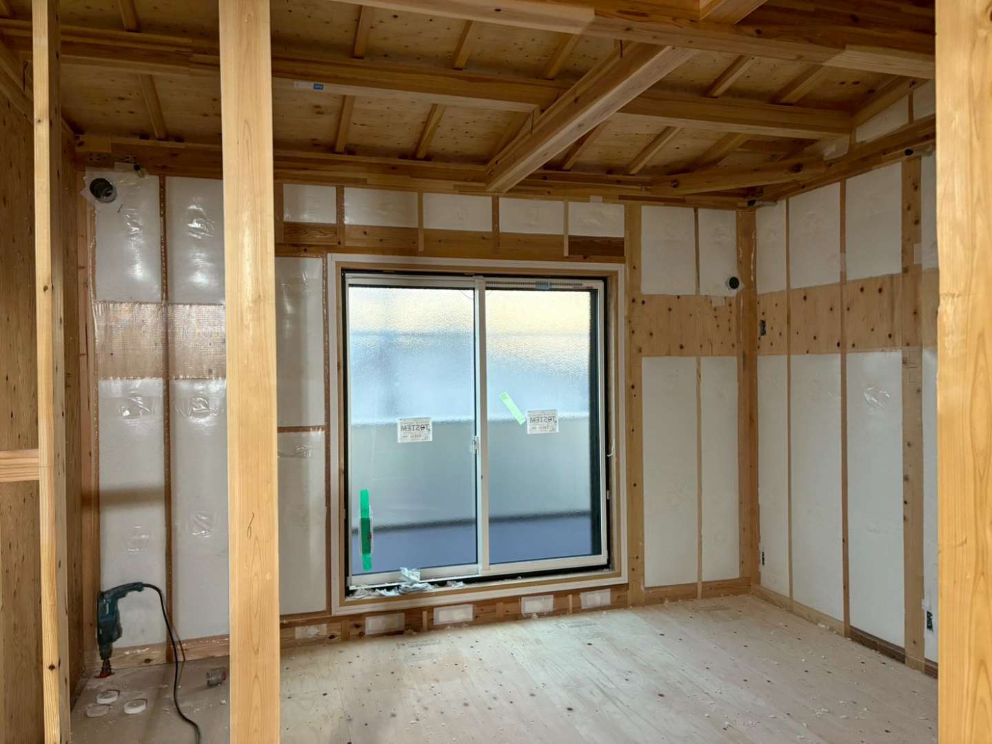 現在は、窓がつき断熱材の吹込みも半分ほど終わっています。